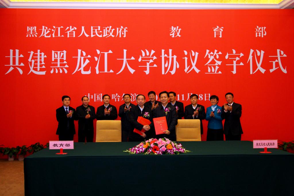 2012 年11 月28 日,黑龙江省人民政府和教育部签署协议,决定共同建设黑龙江大学。教育部部长袁贵仁与黑龙江江省省长王宪魁共同签署了《黑龙江省人民政府、教育部共建黑龙江大学协议》 。共建协议签署后,教育部和黑龙江省人民政府将共同大力加强黑龙江大学的发展建设。教育部将把黑龙江大学纳入相关整体规划,在人才培养基地、重点学科、重点实验室、人文社科基地、工程中心、新增博士和硕士学位点,以及高层次人才培养和团队建设的政策等方面给予直属高校同等对待,并指导和帮助其制定战略发展规划、学科建设规划和师资队伍建设规划。